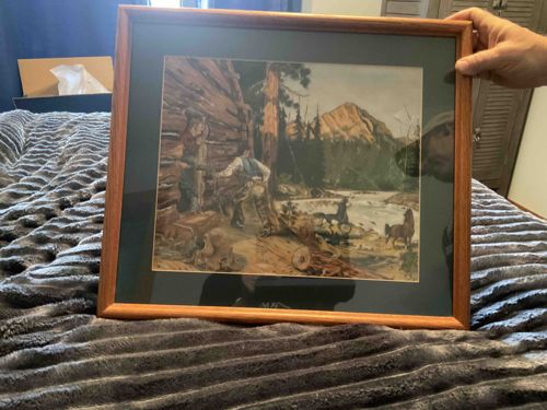 This item is a large-format framed print or watercolor painting depicting a narrative frontier scene. The artwork features two figures, likely pioneers or frontiersmen, positioned near a log structure on the left. The mid-ground shows horses near a flowing river, with a dense coniferous forest and a prominent, sun-lit mountain peak in the background. The color palette consists of earthy browns, forest greens, muted blues for the water, and golden-tan for the mountains. The piece is housed in a simple, light-toned wood frame with a double-matting; the top mat is a dark hunter green, which provides high contrast to the lighter artwork. The glazing appears to be standard non-UV glass, as evidenced by significant reflections in the photograph. Based on the illustrative style, this appears to be a 20th-century piece, possibly a vintage lithographic print after an original work from the mid-century era. The condition appears fair to good, with some minor rippling visible in the paper substrate which may indicate past exposure to humidity. No signatures are immediately visible in the provided image, but the craftsmanship of the framing suggests it was professionally assembled in a modern era (late 20th century).