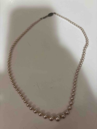 This item is a classic graduated pearl-style necklace, likely dating from the mid-20th century (circa 1940s-1960s). The necklace features a single strand of spherical beads that range in size, with the largest beads positioned at the center front and gradually tapering to smaller diameters toward the clasp. The beads exhibit a soft, creamy white to light ivory luster, characteristic of simulated pearls composed of glass or plastic cores with a pearlescent coating. The construction utilizes a traditional stringing method, and while individual knotting is not clearly visible, the drape suggests a flexible cord. The fastening mechanism consists of a tarnished, silver-toned oval filigree box clasp, which shows signs of significant metal oxidation and patina, indicating age and base metal composition. Physically, some beads appear to have slight surface abrasions or wear to the nacre-like finish, common in costume jewelry of this era. Overall, the piece represents a mid-century staple of feminine fashion, though the heavy tarnish on the clasp and potential thinning of the stringing thread suggest it may require minor restoration to ensure structural integrity and aesthetic appeal.
