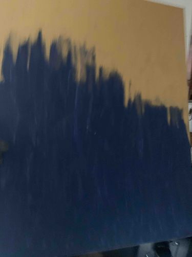 This is a large-format contemporary abstract painting, characterized by its minimalist two-tone composition. The artwork is divided horizontally into two primary color blocks: a solid matte tan or mustard-yellow field across the top and a deep navy blue field occupying the lower two-thirds of the canvas. The defining feature is the organic, vertical brushstrokes that bleed the blue paint into the tan field, creating a jagged, flame-like or forest-silhouette transition. The application of pigment appears thin and matte, suggesting the use of acrylic paint or possibly a stain on canvas or a flat substrate like MDF. There are visible vertical streaks and variations in the saturation of the blue field, indicating a hand-painted process rather than a mass-market print. The edges appear unframed, and the texture suggests a modern industrial or minimalist aesthetic. There are no clear maker's marks or signatures visible from the front view. The overall condition looks stable, though the lighting of the photograph makes it difficult to assess fine surface abrasions or minor scratches. This style is consistent with mid-to-late 20th-century Abstract Expressionist influences, likely a modern decorative piece.