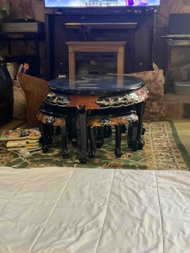 This is a vintage Chinese circular coffee table set, featuring a large central table and six pull-out wedge-shaped stools that nest perfectly beneath the main surface. The set is crafted in the traditional Chinoiserie style, likely dating from the mid-to-late 20th century. The furniture is finished in a high-gloss black lacquer and is heavily decorated with hand-painted scenes and mother-of-pearl or soapstone relief carvings. These decorative panels typically showcase traditional Chinese landscapes, court scenes, or floral motifs, framed by intricate gold-painted borders. The table features a glass top inset into a rounded wooden frame to protect the delicate lacquer work underneath. The legs are designed in a classic cabriole style, terminating in stylized claw or ball feet. Structurally, the set appears to be made of solid wood beneath the lacquer finish. In terms of condition, the lacquer shows a healthy shine, though there is visible dust and potential light surface scratching consistent with age and domestic use. The nesting function suggests high-quality craftsmanship, where each stool is precisely scaled to fit the curvature of the main apron. No major chips or structural repairs are immediately evident from the photograph, though the intricate relief figures should be checked for missing components. This type of furniture gained popularity during the mid-century export boom and remains a sought-after decorative statement piece.