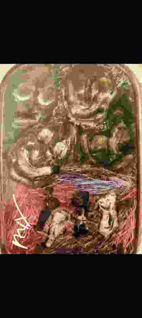 This rectangular, vertical composition is an abstract expressionist mixed media work on a firm support, likely board or a thick paper stock. The piece features a high-texture surface with a rich, varied color palette including earthy browns, deep blacks, vibrant reds, and touches of blue and green. The upper half of the work presents organic, swirled forms resembling a weathered face or landscape, while the bottom section utilizes rapid, gestural strokes. A prominent white linear signature or mark is visible in the lower-left corner, serving as a primary distinguishing element. The style suggests a late 20th-century or contemporary creation. The materials appear to include oil or acrylic paints, possibly combined with pastels or ink to achieve the multifaceted texture. The edges of the piece show some slight darkening or wear, consistent with intentional framing or the age of the materials. No formal manufacturer marks are visible, but the application of the signature indicates an original artist's work rather than a mass-market print. The quality of craftsmanship is reflected in the complex layering and the confident, dynamic movement preserved in the brushwork.