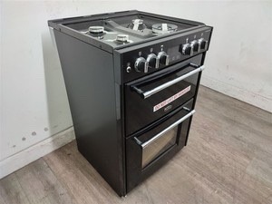 This is a contemporary freestanding double oven gas cooker manufactured by Belling, finished in a sleek black enamel. The appliance features a four-burner gas hob on top with a glass lid that acts as a splashback when raised. The front control panel contains six ergonomic chrome-effect rotary knobs for controlling the gas rings and ovens, alongside a central digital timer display. The unit is configured with a top cavity, which typically functions as a conventional oven and grill, and a larger main oven below with a semi-transparent viewing window. Both doors are equipped with sturdy horizontal chrome-finished handles. Construction appears to be a mix of powder-coated steel side panels and glass-fronted doors. Physically, the item shows signs of light second-hand use with a 'Do Not Lift By Handles' safety sticker still affixed to the top door, suggesting it has been handled or moved recently. No significant structural damage, major rust, or deep scratching is visible from this angle, though minor surface wear Consistent with domestic use is expected. This model represents a modern style, likely manufactured within the last 5 to 10 years, emphasizing functional design and a clean aesthetic suitable for modern kitchen environments.