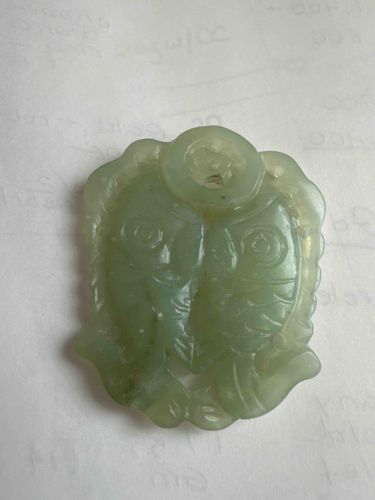 This item is a hand-carved pendant crafted from celadon-colored jadeite or nephrite jade, showcasing a classic 'double fish' (Shuangyu) motif. The pendant measures approximately 4 to 5 centimeters in length and features a pale, translucent greenish-grey hue with subtle milky inclusions typical of natural stone. The design depicts two stylized fish joined at the center, facing each other with tails fanning out at the bottom, topped by a circular bail or bi-disk element for suspension. The carving employs low-relief techniques to define scales, fins, and large circular eyes, with openwork piercing to delineate the outer silhouette and central separation. Symbolically, the double fish represents marital harmony and abundance in Chinese culture. The condition appears fair to good; there are visible surface abrasions and internal fractures (calcification) consistent with age and handling. The carving depth is moderate, indicating traditional hand-tooling rather than modern high-precision machining. While no maker's marks are present, the stylistic execution and patina suggest a production date ranging from the late 19th to the early 20th century (Late Qing to Republic period). The soft, waxy luster of the stone indicates it has likely been handled over time, enhancing its character.