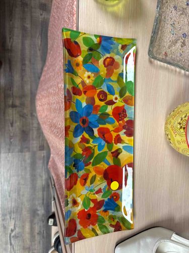 This is a rectangular decorative tray constructed from clear, slumped glass featuring an vibrant interior decoupage or reverse-painted floral design. The piece measures approximately 12 to 14 inches in length and is characterized by its slightly curved upward edges, typical of kiln-fired glass forming. The design is a dense, colorful botanical arrangement including poppies, daisies, and various wildflowers in a palette of primary red, bright blue, sunny yellow, and vibrant green. The floral pattern has a painterly, contemporary feel with stylized shapes and high color saturation. The glass itself appears to be of moderate thickness and clarity, with no visible chips or deep scratches on top. There is a small circular yellow sticker present on the lower right quadrant, likely a price tag or inventory label, which should be carefully removed to avoid adhesive residue. While no maker's mark is immediately visible in this orientation, the style is reminiscent of contemporary home decor designers like Ben's Garden or similar artisan studios utilizing decoupage techniques on glass. The overall condition appears excellent with a glossy finish and intact colors, likely dating from the early 21st century.