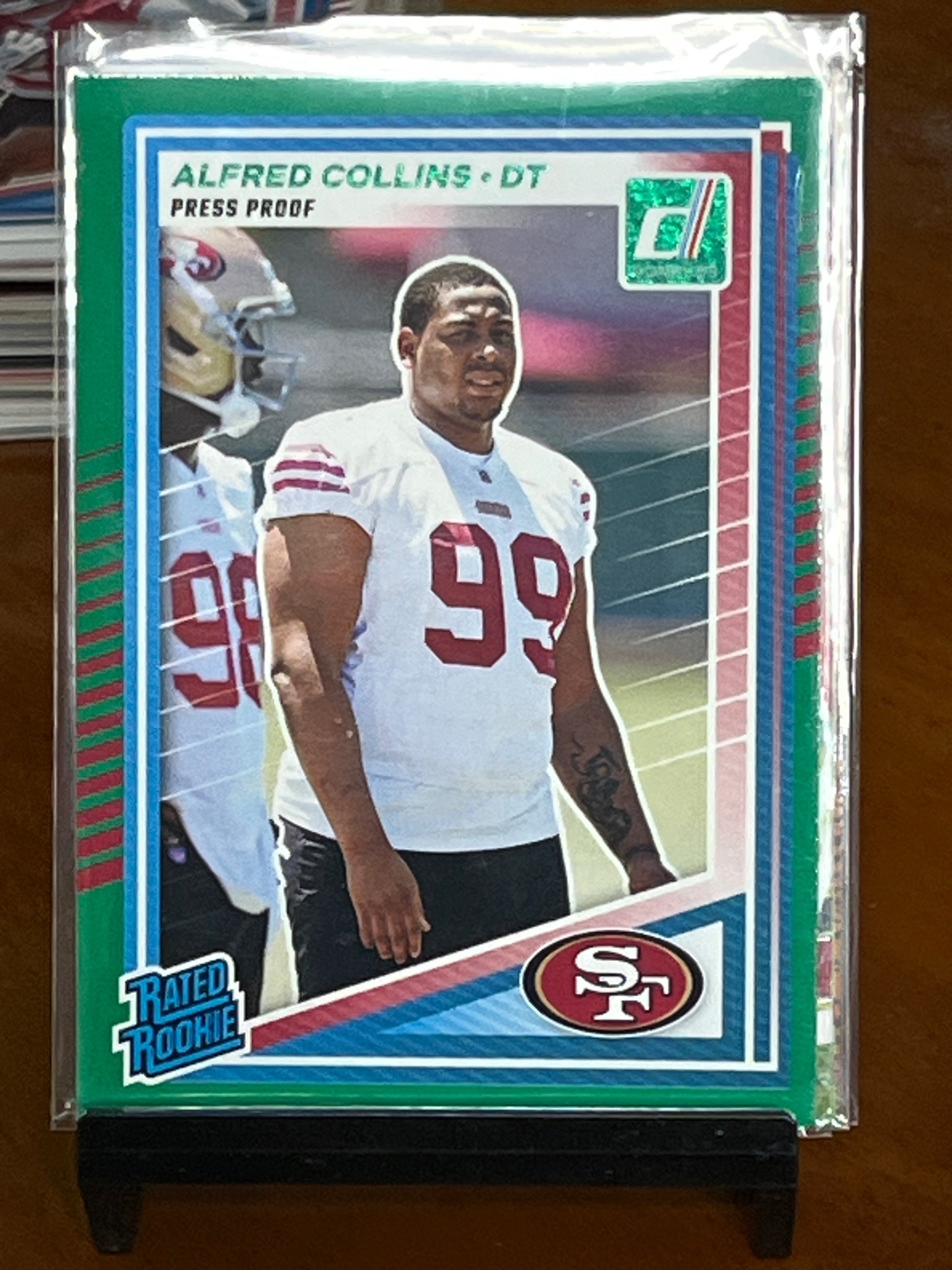 This is a 2024 Panini Donruss football trading card featuring Alfred Collins, a Defensive Tackle (DT) for the San Francisco 49ers. The card is a 'Rated Rookie' variant distinguished by the iconic logo in the bottom left corner and the 'Press Proof' designation under the player's name. It features a vibrant green border with diagonal red and white accents, suggesting it is a specific color parallel. The central image shows Collins in a white San Francisco 49ers away jersey with the number 99. The iconic 'SF' team logo is positioned in the bottom right corner, while the Donruss 'D' logo with a green glitter/shimmer finish is at the top right. The card appears to be standard trading card size (2.5 x 3.5 inches) and is constructed from cardstock with a glossy finish and holographic or 'lazer' elements in the logo and border. The condition appears to be excellent (near-mint) as it is currently stored in a protective soft sleeve (penny sleeve) and a semi-rigid top loader. The centering looks slightly heavy toward the left margin, but the corners appear sharp. There are no signs of surface scratches, creases, or edge wear visible through the protective packaging.