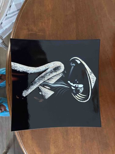 This is a square, slightly concave decorative dish featuring traditional Southeast Asian lacquerware techniques. The piece is finished in a high-gloss black lacquer which provides a stark, reflective contrast to the intricate decorative inlay. The central motif depicts a stylized figure, likely a worker or farmer wearing a traditional conical hat, rendered using 'raden' or mother-of-pearl inlay. The natural iridescent quality of the shell creates a silvery, textured appearance against the dark background. The craftsmanship suggests a contemporary artisanal origin from Cambodia, where lacquerware remains a significant cultural craft. The figure's body is represented by broad, sweeping arcs of shell, while fine lines are used to detail the facial profile and hat. Physically, the item appears to be in good vintage or contemporary condition with a mirror-like finish on the lacquer surface, though there are minor surface reflections and what appear to be slight dust particles or faint surface abrasions typical of high-gloss items. The design is minimalist yet culturally expressive, representing a blend of traditional materials with a modern decorative aesthetic. The edges are clean and slightly curved upward to form a shallow bowl or plate shape, suitable for display or light decorative use.
