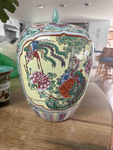 Chinese Famille Jaune Porcelain Ginger Jar with Phoenix and Peony Decoration