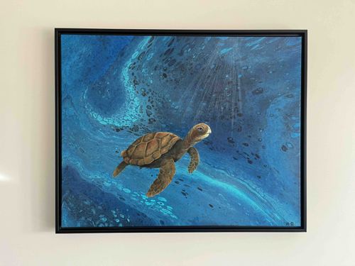 This original contemporary artwork, titled 'Ancient Traveler,' is an acrylic painting on canvas measuring 24x30 inches. The composition features a highly detailed sea turtle swimming through a dynamic underwater environment. The background utilizes a fluid art or 'pour' technique, creating organic, cellular patterns in various shades of deep navy, cobalt, and bright cyan, mimicking the motion of ocean currents. In the upper right quadrant, delicate light rays filter down from the surface, adding depth and a sense of realism to the stylized water. The turtle itself is rendered with fine brushwork, showcasing realistic textures on its carapace and flippers in earthy tones of brown and tan. The piece is signed with the artist's initials 'HD' in the lower right corner. It is presented in a modern, slim black floater frame which provides a clean, professional finish. As a 'new' work, the condition is excellent with no visible wear, cracking, or fading. The contrast between the chaotic fluid background and the precise, figurative subject demonstrates high craftsmanship and a unique mixed-technique style typical of representative modern marine art.