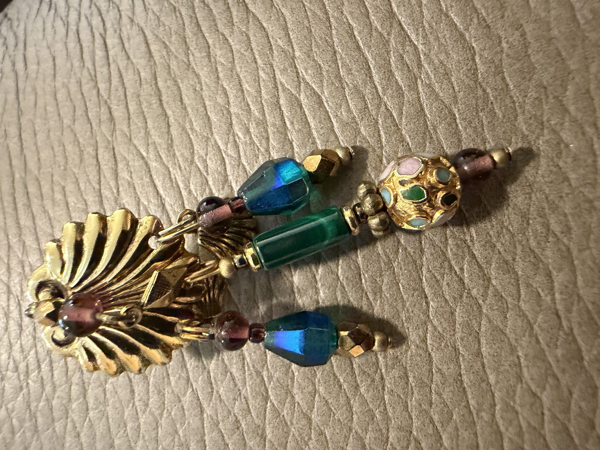 This is a vintage gold-tone decorative dangling accessory, likely a piece of costume jewelry or a fashion charm. The primary structural component is a gold-tone metal shell-shaped cap with a textured, fan-like ribbed design. From this shell, three articulated beaded dangles descend. The central and longest dangle features a rich green malachite-style barrel bead, capped with gold-tone spacers and leading to a round, gold-tone cloisonné or enamel bead decorated with pink, green, and blue floral motifs. The two outer dangles are symmetrical, each featuring a translucent blue bicone glass bead with an iridescent aurum or peacock-style finish, flanked by faceted brass-tone metallic beads and small purple round glass beads. The construction utilizes wire-wrapping and gold-tone jump rings to provide movement to the tassels. The overall aesthetic suggests the 1980s or 1990s, characterized by eclectic material mixing and 'boho-chic' influences. The condition appears fair to good; there are visible signs of wear on the gold-tone finish where the base metal is beginning to show through (pitting and patina), particularly on the shell edges. No maker's mark is visible in the current orientation, but the variety of bead textures indicates a mass-market fashion origin intended to mimic fine jewelry artistry.