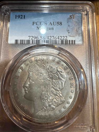This is a United States Morgan Silver Dollar dated 1921, minted in 90% silver and 10% copper. The coin features the classic design by George T. Morgan, with the profile of Liberty on the obverse wearing a Phrygian cap adorned with wheat and cotton, and an eagle with outstretched wings on the reverse (though only the obverse is visible). This specific specimen is house-protected within a professional PCGS (Professional Coin Grading Service) plastic slab, which serves as a guarantee of authenticity and grade. The label identifies it as grade 'AU58' (About Uncirculated), indicating that while the coin has nearly full mint luster, it shows very slight traces of wear on the highest points of the design, such as Liberty’s cheek and the hair above her ear. The coin's surface exhibits a natural metallic silver patina with some minor bag marks and scuffs consistent with its age and technical grade. The PCGS certification number 42764222 is clearly visible on the label along with the 1921 date, confirming it belongs to the final year of the regular Morgan Dollar series production. The strike appears moderately sharp, and the rim is well-defined with denticles intact, demonstrating the typical craftsmanship of the early 20th-century Philadelphia mint (no mint mark visible near the date).