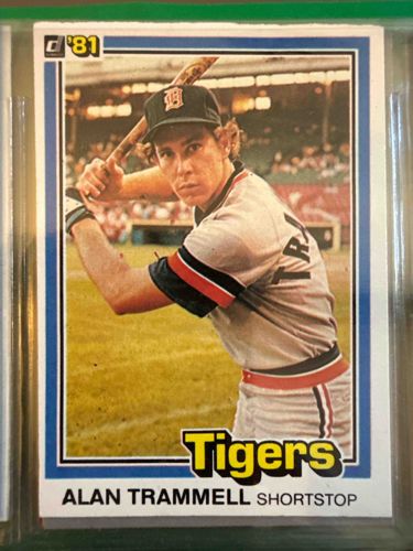 This is a vintage 1981 Donruss baseball card featuring Alan Trammell, the Hall of Fame shortstop for the Detroit Tigers. The card measures the standard 2.5 by 3.5 inches and is constructed from typical early 1980s cardboard stock. The design features a white border with a blue inner frame surrounding a color photograph of Trammell in a batting stance, wearing the Tigers' road gray uniform with navy and orange trim. The top left corner displays the 'Donruss 81' logo in yellow and black. The bottom of the card includes the team name 'Tigers' in bold yellow lettering with black outlines and Trammell's name and position in black text. Known for being part of Donruss's inaugural year in the baseball card market, this specific card shows some common production traits of the era, including slightly off-center borders, specifically favoring the left side. The corners appear relatively sharp, though the top right corner shows very minor softening. The surface color is vibrant with no significant fading or staining visible through the protective plastic holder. There are no major creases or tears, suggesting the card has been well-preserved. This is a significant card for collectors of Detroit Tigers memorabilia and Hall of Fame players.