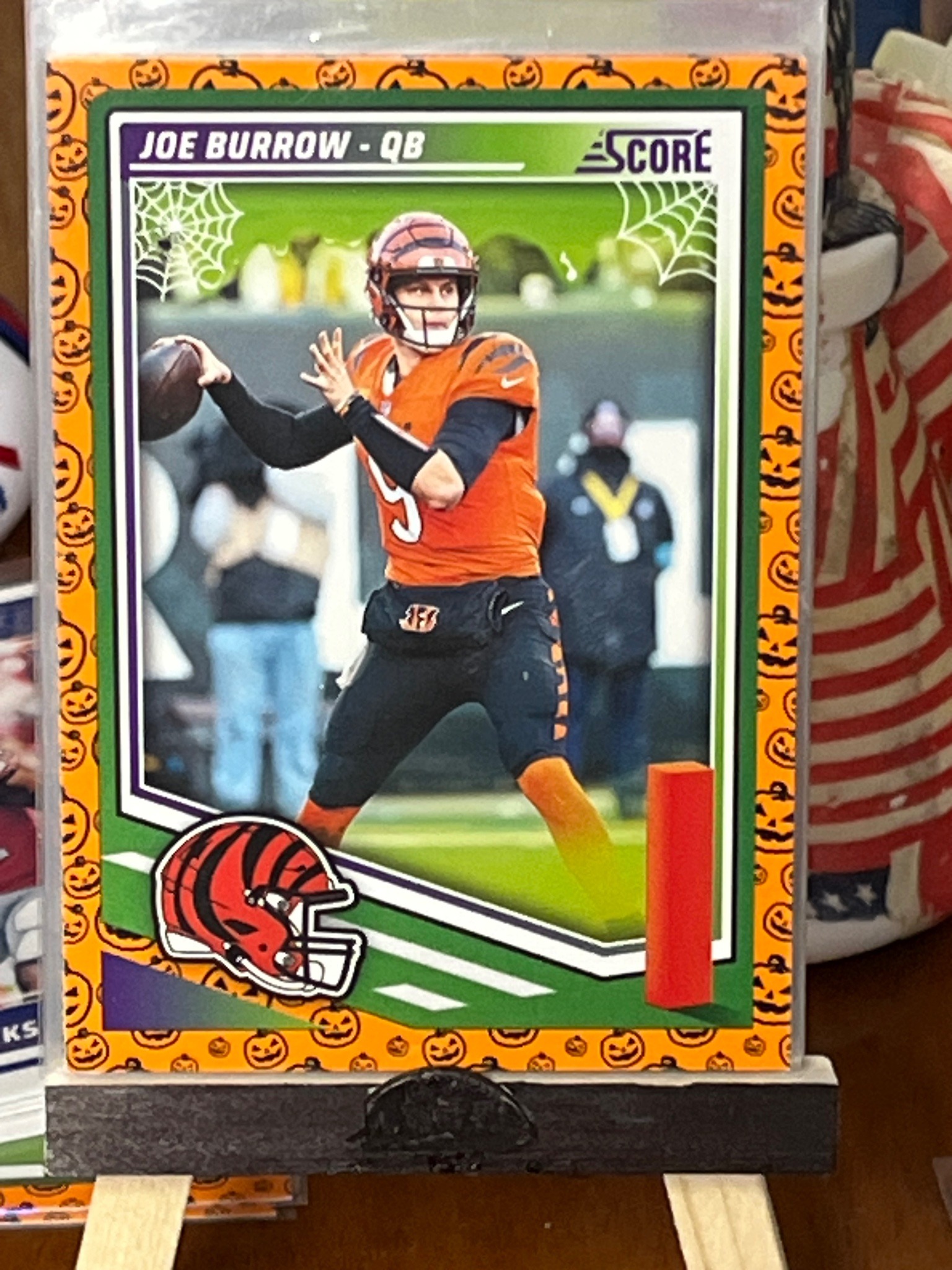 This is a 2023 Panini Score football card featuring Cincinnati Bengals quarterback Joe Burrow. The card is a limited-run seasonal parallel known as the 'Hocus Pocus' edition, specifically produced for the Panini Score Halloween brand. The card measures 2.5 by 3.5 inches and is constructed from standard cardstock with a matte finish and vibrant orange borders. The most distinguishing characteristic is the unique 'Halloween' themed border featuring a repeating pattern of black jack-o'-lanterns on a bright orange background. Additionally, the interior card graphics include stylized white spiderwebs in the upper corners. Joe Burrow is depicted in his orange Cincinnati Bengals home jersey and black pants, captured in a throwing motion. The Cincinnati Bengals helmet logo is positioned at the bottom left, and the 'Score' brand logo appears in the top right. The card is currently housed in a clear protective sleeve (penny sleeve) and displayed on a small wooden easel. Based on visual inspection through the sleeve, the card appears to be in 'Near Mint' to 'Mint' condition, with sharp corners, clean edges, and no visible surface scratches or creases. This modern collectible is part of a 2023 release and represents a popular player-specific short-print parallel.