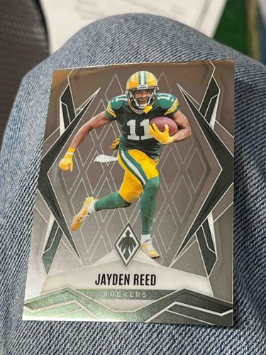 This item is a 2023 Panini Phoenix trading card featuring wide receiver Jayden Reed in his Green Bay Packers uniform. The card shows Reed in a dynamic action pose, carrying a football and wearing his number 11 jersey. The design is characteristic of the Phoenix brand, featuring a metallic finish with geometric, angular patterns that frame the player. The background consists of modern shapes and a stylized Phoenix logo at the bottom center. The player's name "JAYDEN REED" and team "PACKERS" are printed in clear capital letters toward the bottom. In terms of condition, the card appears to be raw and ungradated. The upper left corner shows a visible soft edge or minor crease, and the bottom right corner appears slightly worn. The surface shows some light fingerprinting or smudging, which is common with high-gloss metallic cards from this set. The centering appears slightly heavy toward the right side. This card represents a modern 'rookie' year piece for a prominent young NFL player, utilizing high-quality cardstock and refractive printing technology characteristic of contemporary high-end sports collectibles.