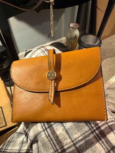 This item is a compact, rectangular crossbody bag or clutch, crafted from a pebble-grained material in a warm tan or ginger-brown hue. The bag features a prominent curved front flap that secures via a unique vertical strap closure, which is anchored by a polished gold-toned circular metal hardware piece. The construction exhibits visible edge painting in a darker contrasting shade and uniform machine-stitching along the perimeters of the flap and the strap. The material appears to be either a genuine leather with a glazed finish or a high-quality synthetic leather (PU), showing a subtle grain texture and slight sheen. Measuring approximately 7 to 8 inches in width, its silhouette is structured and minimalist. The strap design suggests a contemporary fashion aesthetic, likely produced within the last ten years. In terms of condition, the piece appears well-maintained with no significant scuffing or color loss visible on the primary surfaces, although the lower right corner shows very minor edge wear. The hardware remains bright and free of substantial oxidation. The interior is not visible, but the exterior suggests a single-compartment design suited for light daily use or evening out.