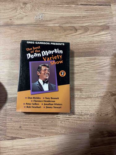 This item is a physical media release titled 'The Best of the Dean Martin Variety Show, Volume 2,' presented by Greg Garrison. The artwork features a classic portrait of Dean Martin in a tuxedo and black bowtie, set against a dark purple background within a smaller frame. The color scheme of the cover transition from black on the top half to a warm orange-yellow on the bottom. The text is rendered in stylized white, yellow, and black fonts. It lists several high-profile guest stars including Don Rickles, Tony Bennett, Florence Henderson, Peter Sellers, Jonathan Winters, Bob Newhart, and Jimmy Stewart, which are notable features for collectors of classic television. The item appears to be in its original cardboard or plastic sleeve. The physical condition shows some signs of edge wear and minor scuffing on the corners of the packaging, consistent with age and previous handling. There are no obvious tears or deep structural damage visible in the primary image. Based on the graphic design and the nature of the collection, this release likely dates from the late 1990s to early 2000s when these archival variety show segments were popularized for home media. The craftsmanship is typical of mass-produced commercial media of that era, focused on high-contrast marketing to appeal to fans of 1960s-70s television nostalgia. The item sits on a light-colored wood-grain laminate flooring.
