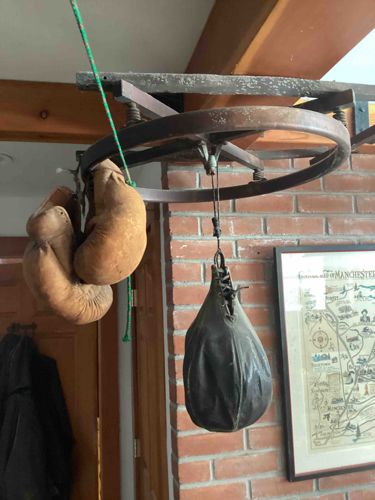 Vintage punching bag, speed bag, and vintage boxing glove the gloves say something about Winston and Company