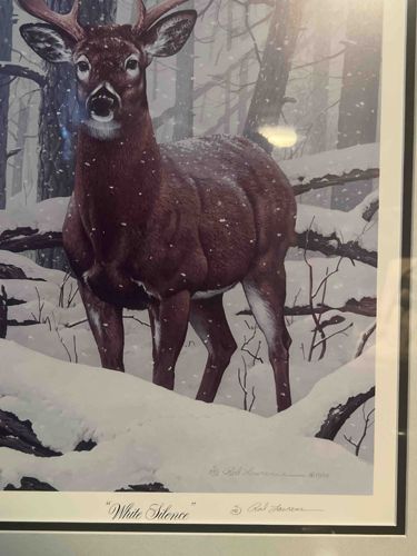This item is a framed wildlife art print titled 'White Silence' by the renowned artist Rod Lawrence. The artwork depicts a majestic white-tailed buck standing in a snowy forest landscape. The buck is rendered in rich, deep brown and reddish tones, which contrast sharply against the cool, muted purples, blues, and whites of the winter scenery. The composition features falling snow and a dense backdrop of bare trees, creating a serene and atmospheric winter scene. Physically, the print is matted within a professional frame, though the precise dimensions of the frame are not specified. Notable markings include the printed title 'White Silence' at the bottom center and a hand-signed signature by Rod Lawrence alongside a copyright symbol and an edition number (likely 82/400) visible in the lower right portion of the image area and on the margin. The print appears to be a high-quality lithograph or digital print on heavy paper stock. The condition appears to be excellent with no visible fading, tears, or acid-burn, suggesting it was housed behind glass in a climate-controlled environment. Rod Lawrence is known for his detailed realism and accurate anatomical depictions, which is evident in the musculature and textures of the deer's coat. This piece likely dates from the late 20th or early 21st century, representing a classic style of American outdoor and sporting art.