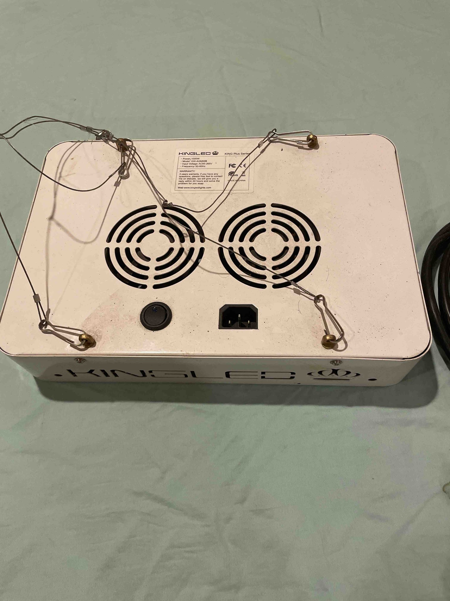 This is a King Plus Series Full Spectrum LED Grow Light, model GW-AQM55B, rated at 1000 watts. The unit features a rectangular metal chassis with a white powder-coated finish and rounded corners. The top panel includes a manufacturer identification sticker including technical specifications (Input Voltage: AC85-265V, Frequency: 50-60Hz) and regulatory markings (FCC, CE, RoHS). Functionally, the top side is equipped with two circular ventilation grilles and cooling fans, a standard IEC 320 C14 power inlet, and a circular on/off toggle switch. For suspension, the unit has four eyelet mounting points connected to a steel wire hanging kit with metal carabiner clips. The 'KINGLED' logo is visible on the side panel. Regarding condition, the unit shows signs of active use, including surface dust accumulation in the fan vents, light scuffing on the white finish, and minor discoloration/staining near the power switch and corners. The hanging wires appear slightly tangled but intact. This model typically utilizes 10W Double Chips for high-intensity lighting suitable for all stages of indoor plant growth. This contemporary horticultural lighting fixture was likely manufactured in China within the last 5-8 years.