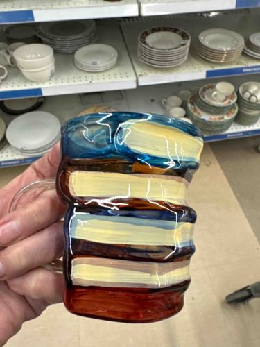 This unique piece of studio art glass is a hand-blown mug designed to resemble a stack of books. The body features a cylindrical yet irregular form with pronounced horizontal indentations that simulate the individual spines of four distinct volumes. The color palette is rich and earthy, utilizing amber, cobalt blue, and clear glass with internal opaque white and yellow banding to mimic the edges of pages. A clear glass handle is applied to the side. The construction shows high levels of craftsmanship, with a thick-walled design and a smooth, glossy fire-polished finish. The piece reflects a late 20th-century or early 21st-century contemporary craft aesthetic, common among independent glass artists. While no maker's mark is immediately visible in the image, the stylized 'stack' is a hallmark of decorative novelty art glass. The condition appears excellent with no visible chips, cracks, or heavy scratching, though light shelf wear on the base would be expected given its location. The irregular shape provides a tactile grip, though the primary value lies in its whimsical, sculptural design rather than purely utilitarian function.