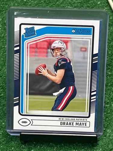 This is a 2024 Donruss 'Rated Rookie' football trading card featuring quarterback Drake Maye of the New England Patriots. The card follows the classic Donruss design aesthetic with a primarily white border, accented by the signature blue 'Rated Rookie' logo in the upper left corner and the Donruss logo in the upper right. The central photograph depicts Drake Maye in a New England Patriots home jersey, holding a football in a triple-threat stance on a practice field. The player's name and team occupy the bottom text field, styled with clean, modern typography. Physically, the card is standard 2.5 by 3.5 inches and appears to be constructed of high-gloss cardstock. It is currently housed in a clear protective top-loader inside a transparent sleeve, which helps preserve its condition. Based on visual inspection through the plastic, the centering appears relatively balanced with slight bias towards the left border. The corners and edges seem sharp with no visible whitening or chipping, indicating a likely 'Pack Fresh' Near-Mint to Mint condition. As a contemporary 2024 release, this item represents a key rookie card for a high-draft-pick quarterback, making it a significant piece for modern football collectors. The craftsmanship is typical of Panini America's Donruss line, featuring vibrant printing and crisp graphic lines without any visible manufacturing defects like print lines or surface dimples in the photograph area.