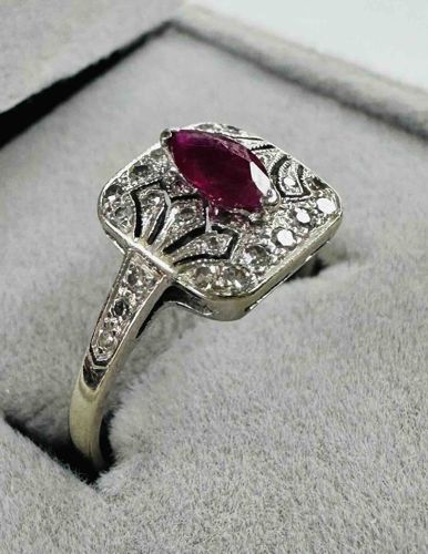 This is an elegant Art Deco style ring featuring a central marquise-cut ruby of a deep pigeon-blood red hue. The ruby is securely held in a two-prong setting atop a square-shaped platinum or white gold face. The surrounding setting is intricately designed with geometric filigree and openwork characteristic of the 1920s-1930s era. It is embellished with approximately fourteen small round-cut accent diamonds, pave-set to maximize brilliance against the white metal. The shoulders of the ring transition into a thin, polished band and are also accented with small diamonds within milgrain-edged borders. The overall craftsmanship displays high-quality hand-finishing, with delicate scrolling patterns and fan-like motifs visible in the metalwork beneath the central stone. Condition appears excellent with minor surface wear consistent with age; the stones appear securely set with no visible chips or fractures on the ruby's table. The style suggests an appraisal as a vintage or high-quality revival piece crafted to emulate the geometric sophistication of the Art Deco period.