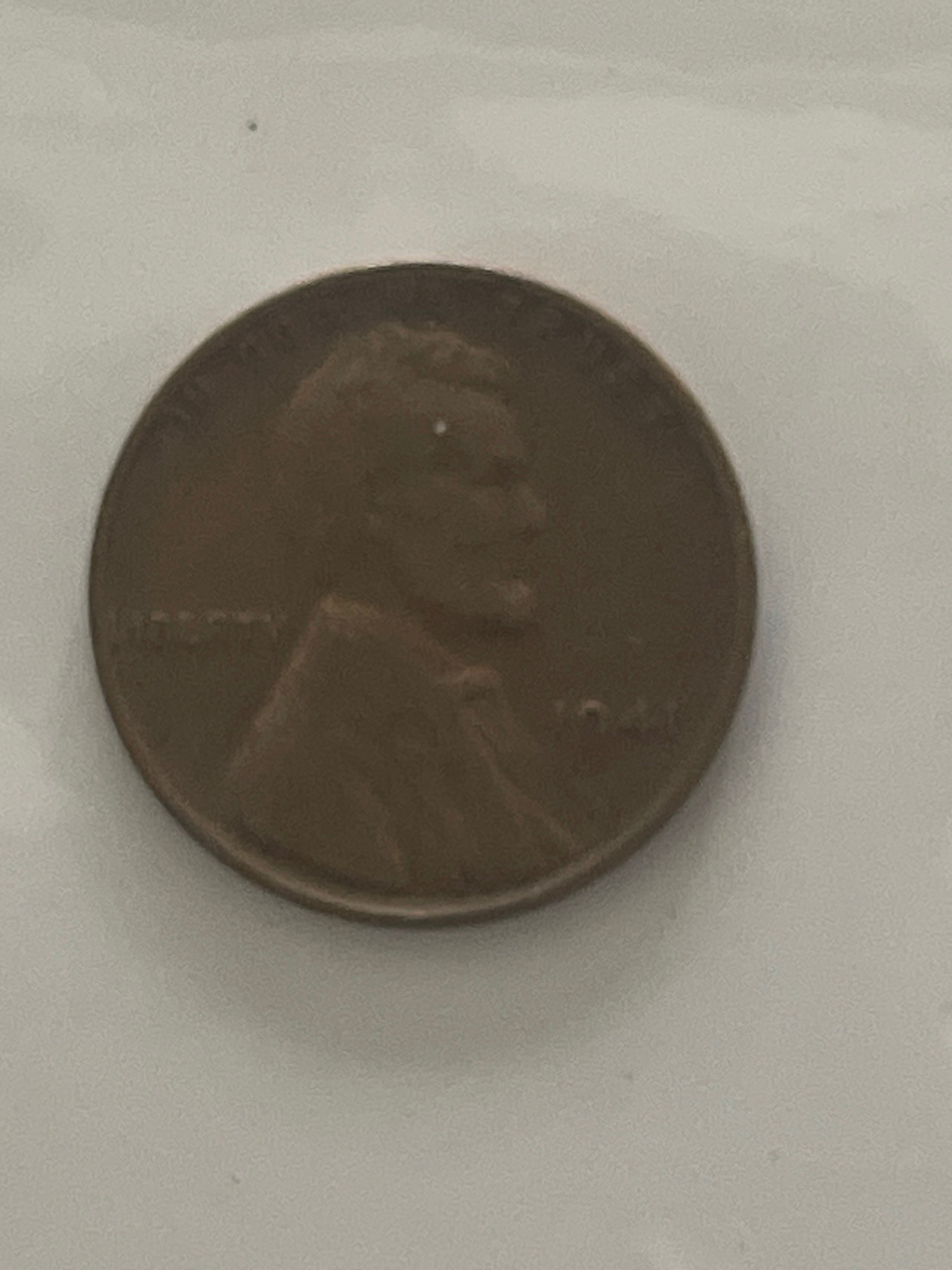 This is a 1941 United States Lincoln Wheat Cent. While the user notes '1 ounce silver', the visual evidence and historically accurate specifications for this date indicate a bronze composition consisting of 95% copper and 5% tin and zinc. The coin features the iconic right-facing profile of Abraham Lincoln on the obverse, designed by Victor David Brenner. The date '1941' is clearly visible in the lower right field, and the word 'LIBERTY' is struck on the left. The phrase 'IN GOD WE TRUST' arches along the top rim. Physically, the coin shows significant circulation wear, resulting in a dark brown patina and softened details in Lincoln's hair and coat. There is a small, light-colored blemish or strike mark near Lincoln's forehead. The rims appear intact but demonstrate minor flattening and smoothing consistent with an 'About Good' (AG) to 'Good' (G) numismatic grade. The overall surface is dull and lacks original mint luster, typical for a coin that has spent considerable time in general commerce. The craftsmanship reflects the mass-production standards of the Philadelphia Mint for that era, with no visible mint mark below the date.