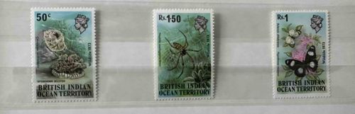 This is a collection of three commemorative postage stamps from the British Indian Ocean Territory (BIOT), issued in 1973 as part of a wildlife definitive or special series. The stamps feature vertical orientations with perforated edges, printed on standard gummed stamp paper. Each stamp depicts different local fauna: the 50c stamp showcases an Upside-Down Jellyfish (Cassiopea andromeda), the Rs. 1.50 stamp features a spider (Nephila madagascariensis) on its web, and the Rs. 1 stamp illustrates a butterfly (Hypolimnas misippus) on flora. In the upper right corner of each stamp is the profile of Queen Elizabeth II in silver or grey, indicating the territory's status as a British Overseas Territory. The text 'BRITISH INDIAN OCEAN TERRITORY' is printed clearly at the bottom in a bold, black serif font. The printing quality is high, utilizing multi-color offset lithography with a distinct green-blue wash in the backgrounds. The stamps appear to be in Mint Never Hinged (MNH) or fine used condition, housed within a clear protective plastic philatelic strip. No visible foxing, creases, or heavy cancellations are present, preserving the vibrant greens, browns, and blacks of the biological illustrations. The year '1973' is vertically printed on the right side of each illustration, confirming the issue date.