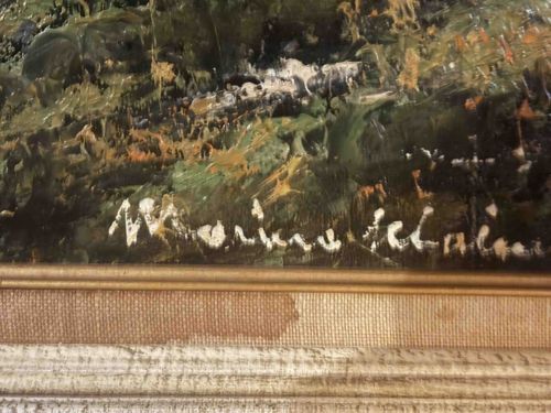 This item is an original oil painting executed in a heavy impasto, impressionistic style. The composition features a dense, textured landscape with a palette of deep forest greens, ochre, sienna, and highlights of white or cream, suggesting light filtering through foliage or a rocky terrain. The painting is notable for its thick, visible brushstrokes and palette knife applications that create significant three-dimensional depth on the canvas surface. A prominent white signature, which appears to read 'Markelov', is situated in the lower right quadrant of the image. The artwork is housed in a mid-century period wooden frame featuring a gilded inner lip and a textured burlap or linen liner. There are visible condition issues, specifically a large, dark water stain or liquid damage mark on the lower portion of the linen liner, which indicates past exposure to moisture. The painting itself shows a rich patina with possible light dust accumulation in the crevices of the impasto. Judging by the frame style and the artist's technique, the piece likely dates from the mid-to-late 20th century. The quality of the brushwork indicates a confident hand and a formal understanding of color theory and texture.