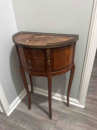 This is a small-scale semicircular (demi-lune) bedside or side table, crafted in the Louis XV Transitional style. The piece features a kidney-shaped profile with three central drawers and two flanking curved side panels. It is constructed primarily of wood with mahogany and fruitwood veneers, exhibiting fine marquetry and parquetry work. The top surface is enclosed by a pierced brass or ormolu gallery rail with a geometric pattern, though it shows significant damage including missing sections of veneer and a possible water stain or lifting of the surface inlay. The drawers are adorned with fine stringing and small metal pulls. Gilt metal ormolu mounts, designed with neoclassical floral and ribbon motifs, decorate the front stiles. The table stands on four slender cabriole legs, terminating in delicate feet. Condition-wise, the item shows substantial wear; the veneer on the top is peeling or chipped in two prominent areas, and there is visible scratching and finish loss across the body and legs. The craftsmanship suggests a 20th-century revival piece, likely mid-century European, aiming to replicate the elegance of 18th-century French court furniture. Despite the surface damage, the structural silhouette remains elegant, though it requires professional restoration for its veneer and potentially a polish to revive the wood grain.