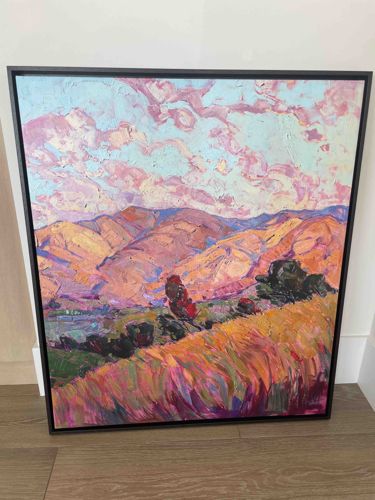 This is a contemporary oil painting on canvas by renowned artist Erin Hanson, titled 'Dawn'. Executed in her signature 'Open Impressionism' style, the work features a vibrant landscape characterized by thick, impasto brushwork and a vivid palette of pink, orange, purple, and gold. The composition depicts rolling hills under a dramatic sky filled with textured clouds, conveying the warm light of sunrise. The canvas is a 3D gallery-wrapped format, indicating a thick depth (likely 1.5 to 2 inches) that allows the painting to continue around the edges. It is housed in a modern, slim black floater frame which creates a professional gap between the artwork and the frame edge. The craftsmanship displays high-quality application with rhythmic, unblended strokes that create a sense of movement and mosaic-like texture. Based on the style and typical production, this piece likely dates to the late 2010s or early 2020s. The condition appears excellent with no visible signs of cracking, fading, or mechanical damage to the frame. The energetic application of paint and high color saturation are hallmarks of Hanson's highly collectible studio work.