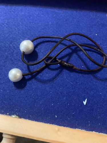 This item is a contemporary lariat-style necklace featuring two large white cultured pearls mounted on a dark brown leather cord. The pearls appear to be freshwater or South Sea variety, displaying a round to near-round shape with a soft, white luster and some visible surface irregularities characteristic of natural growth. The leather cord is approximately 1.5mm to 2mm in diameter, exhibiting a matte finish and a deep chocolate brown hue. The construction involves the cord being threaded through the center-drilled pearls, which are secured at the ends with what appears to be adhesive or internal knotting. A notable structural feature is the sliding loop mechanism created by a series of tight cord wraps, allowing the length of the necklace to be adjusted by the wearer. The piece displays a rustic yet elegant aesthetic, typical of high-end bohemian or coastal jewelry styles from the late 20th to early 21st century. Condition appears good, with the leather showing minor suppleness and no significant fraying, while the pearls retain their pearlescent coating with only minor surface pitting visible upon close inspection. No visible maker's marks or metal fineness stamps are present, suggesting a handcrafted or boutique origin.