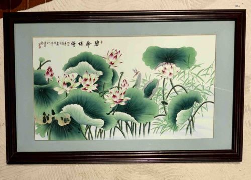 Ling Xue , a master of the Gongbi (meticulous brush) style, specifically focusing on flowers and birds. The inscription consists of a poetic line followed by a formal dating and the artist's signature Date is Spring 1987 : size 24”x 40” enamel paint on porcelain panel frames and incased with glass and wooden frame and backing the art itself is in excellent condition free from any cracking or chips and the colors have been well preserved and remain vibrant throughout