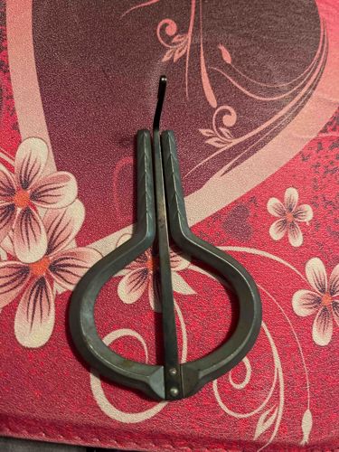 This is a traditional musical instrument known as a Jew's harp, specifically a metal frame style often referred to as a drymba or khomus. The instrument consists of a robust, heart or lyre-shaped outer frame made of a dark-toned metal, likely forged steel or a similar alloy, which possesses a matte, slightly oxidized charcoal finish. A thin, flexible metal tongue, or lamella, is securely riveted to the base of the frame with two visible circular fasteners and extends through the center, terminating in an upwardly curved trigger or 'trigger-hook' at the top. The arms of the frame feature subtle, decorative horizontal scoring or textured ridges that aid in grip. In terms of condition, the item shows signs of age-appropriate wear, including minor surface patina, slight discoloration along the length of the central reed, and small scuffs on the frame edges. The construction appears sturdy and functional, reflecting a piece intended for play rather than purely decorative purposes. This style of instrument belongs to the idiophone category, where sound is produced by the vibration of the central reed while held against the player's teeth or lips, using the mouth cavity as a resonator. This particular design is common in Eastern European and Central Asian folk traditions from the mid-20th century to the contemporary era.