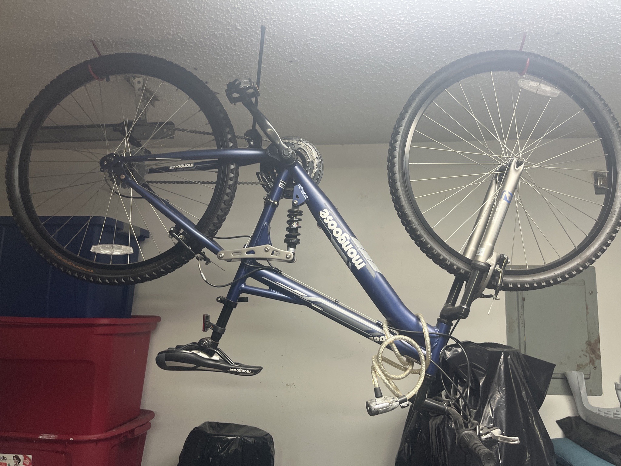 This is a mass-market, full-suspension mountain bike manufactured by Mongoose, likely dating from the early to mid-2000s. The frame is finished in a metallic navy blue with white and silver 'Mongoose' branding decals prominent on the down tube and chainstays. The bicycle features a Y-frame design typical of entry-level mountain bikes from this era, constructed using welded steel or aluminum alloy tubing. Key mechanical components include a front suspension fork with silver-finished stanchions and a rear coil-over shock absorber integrated into the linkage. The drivetrain consists of multiple gears with a three-ring crankset and a rear derailleur system, though the specific brand (likely Shimano or SRAM entry-level) is not fully visible. The bike is equipped with linear-pull V-brakes, knobby black tires mounted on silver alloy rims with standard spokes, and a black saddle with white 'Mongoose' lettering. Notable features include a cable-style combination lock wrapped around the frame and a kickstand. The overall condition appears used but intact; there is minor surface wear on the frame and tires, and the accumulation of dust suggests it has been stored for some time in a garage or shed. The craftsmanship is standard for consumer-grade sporting goods intended for recreational trail use rather than professional competitive cycling.