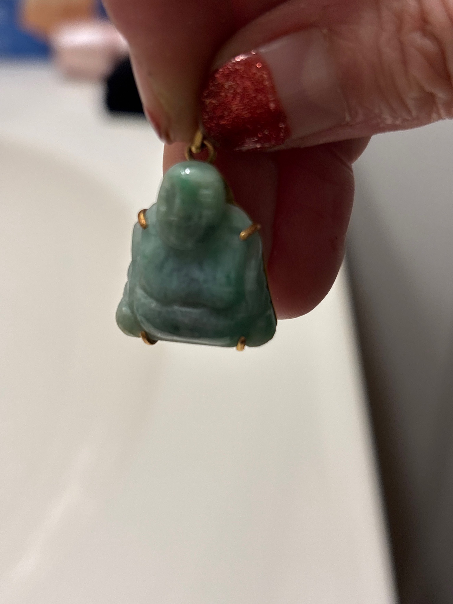 This item is a small, hand-carved pendant depicting Budai, commonly known as the Laughing Buddha. The piece is crafted from translucent to semi-translucent green jade, likely jadeite, exhibiting a mottled appearance with varying shades of celadon and forest green across its surface. The carving follows traditional iconography, featuring a rotund figure in a seated posture with a prominent belly and a smiling facial expression. The stone is held within a simple four-prong yellow gold setting (estimated 14k or 18k based on common jewelry of this type) that follows the silhouette of the carving. A small gold jump ring is attached at the top for suspension from a chain. Regarding condition, the jade shows a smooth, glossy polish with no immediately apparent fractures or chips, though natural internal inclusions and clouds are visible, which is characteristic of genuine jadeite. The gold prongs appear secure and intact. There are no visible maker's marks or stamps on the front; such marks would typically be found on the back of the setting or the bail. This style of 'Good Fortune' jewelry was highly popular in the mid-to-late 20th century and remains a staple in Cantonese-style jewelry design. The craftsmanship shows moderate detail, with softly rounded features that suggest a commercial-grade high-volume production rather than a one-of-a-kind master carving.