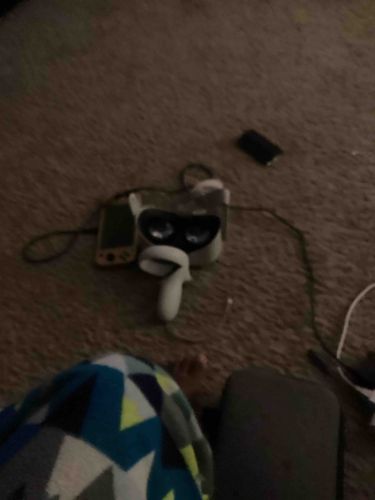 This item is a Meta Quest 2 (formerly Oculus Quest 2) virtual reality gaming system, appearing in its signature white and light-grey color palette. The assembly includes the primary head-mounted display (HMD) unit and at least one proprietary handheld Touch controller. The headset features a white plastic injection-molded outer shell, a black padded facial interface with dual internal lenses, and an adjustable flexible soft strap system. The accompanying controller is ergonomic in design, featuring a white matte finish, a tracking ring, and integrated buttons. Based on visual inspection, the units appear to be in used condition, resting on a brown carpeted surface amidst various cables and a handheld gaming console (possibly a Nintendo Switch). The headset's internal lenses are visible, reflecting ambient light, which is a critical area for inspection as scratches to the optics significantly devalue the hardware. No significant cracks or structural damage are immediately apparent in this low-light photograph, though some surface scuffing common to the matte white plastic may be present upon closer inspection. The hardware represents the modern era of standalone VR technology (circa 2020-present) and is characterized by its high-quality build and integrated tracking sensors hidden behind the front faceplate.
