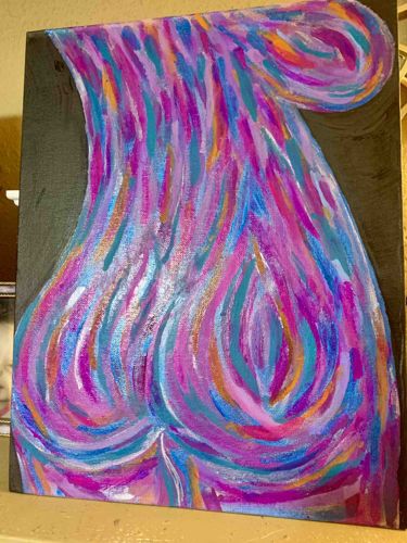 This is an original contemporary acrylic painting on a vertically oriented stretched canvas, depicting an abstract silhouette of a human torso. The composition features a central, vibrant figure rendered with thick, expressive impasto brushstrokes in a palette dominated by purples, magentas, violets, and teals, with accents of orange and gold. These rhythmic, vertical strokes create a sense of movement and contouring that defines the anatomical shape against a flat, solid black background. The application of paint suggests a modern, neo-expressionist style, possibly influenced by fauvism in its use of non-representational color. The canvas appears to be a standard studio-grade stretched fabric over a wooden frame. No visible artist signature or date is discernible on the front of the piece. The condition appears fair to good with no immediate signs of cracking or flaking; however, the paint application is heavy and textured. The edge work appears somewhat unfinished, typical of contemporary amateur or student works. There is light surface glare suggesting a semi-gloss finish or varnish, indicating the work is relatively recent, likely dating from the 21st century. The craftsmanship emphasizes texture and emotional color over precision.