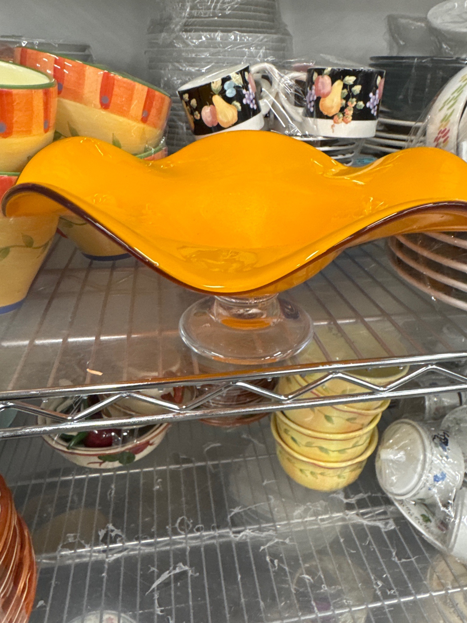 This item is a decorative footed bowl featuring a vibrant marigold or bright amber primary color with a dark brown or black glass trim along the rim. The bowl is constructed of thick-walled glass, likely cased, showing a semi-opaque 'slag' or end-of-day appearance that was popular in mid-20th-century glassware. The most striking characteristic is the deeply ruffled or undulating 'hand-kerchief' style rim, which flows naturally into wide, sweeping waves. It sits atop a short, clear glass pedestal base with a rounded foot. In terms of condition, the glass appears to be in good structural order with no visible cracks or deep chips, though typical shelf wear on the bottom of the foot is likely. The color saturation is consistent and bold, suggesting a manufacturing style similar to Viking Glass or Fenton, though most commonly associated with the mid-century modern era (circa 1960s-1970s). The craftsmanship displays high-quality hand-finishing, particularly in the symmetry of the ruffles. While no maker's mark is visible through the shelf, the organic form and contrasting edge banding (cap rim) are hallmarks of art glass from this period. It measures significantly wider than its height, making it a dramatic center-piece or fruit bowl.