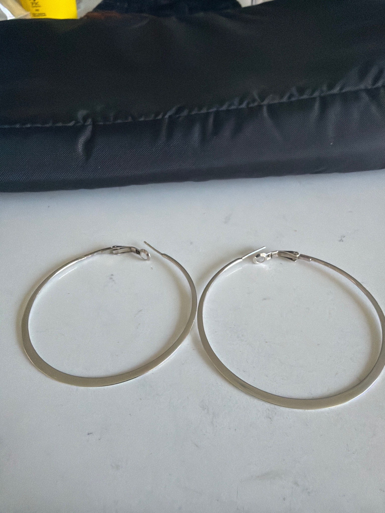 This item consists of a pair of large, circular hoop earrings featuring a silver-toned metallic finish. The construction is distinctive due to its flat, ribbon-like profile rather than a traditional round wire design, which allows for broader light reflection across the surface. They measure approximately 2.5 to 3 inches in diameter, placing them in the category of 'oversized' fashion hoops. The earrings utilize a classic saddleback or hinged snap-top closure, where a thin ear wire clicks into a U-shaped notched catch on the opposite side of the hoop for security. The metal appears to be a polished base metal or silver-plated alloy, as evidenced by the high-shine finish and slight dulling near the hinge mechanisms. No prominent hallmarks or maker's marks are visible in the image, suggesting these are contemporary mass-market fashion accessories likely produced within the last 10-15 years. The condition is fair to good, with some visible bending in the ear posts and slight surface scratches consistent with regular wear and storage. One earring shows a slight asymmetry in its circular curve, likely from minor impact or compression during use. These represent a minimalist, modern aesthetic focused on sleek lines and light-catching geometry.