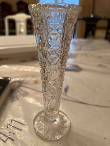 This is a vintage colorless, transparent bud vase featuring a classic trumpet silhouette with a flared rim and a narrow, tapered neck that widens slightly as it descends toward a weighted circular pedestal base. The piece is constructed from pressed glass, characterized by an intricate, geometric 'Diamond and Star' or 'Cane' pattern repeating vertically along the body. These raised elements create a textured surface that enhances light refraction and brilliance. The base is finished with a rayed or sunburst pattern on the underside to provide stability and visual continuity. Measuring approximately 6 to 8 inches in height, the glass exhibits a slight grayish or yellowish tint common in older mass-produced flint or soda-lime glass, likely dating back to the mid-20th century (circa 1940s-1960s). The craftsmanship displays visible mold seams, which is typical for pressed glass of this era rather than hand-blown crystal. In terms of condition, the item appears to be in good vintage state with no major cracks or large chips visible in the primary image; however, there is typical light surface wear and potential 'flea bites' or minute roughness along the inner rim and base edge consistent with age and frequent use. There are no immediate visible maker's marks or signatures, suggesting it may be a product of a prolific American glass manufacturer such as Anchor Hocking, Hazel-Atlas, or Imperial Glass, who specialized in affordable yet decorative tablewares for the domestic market.