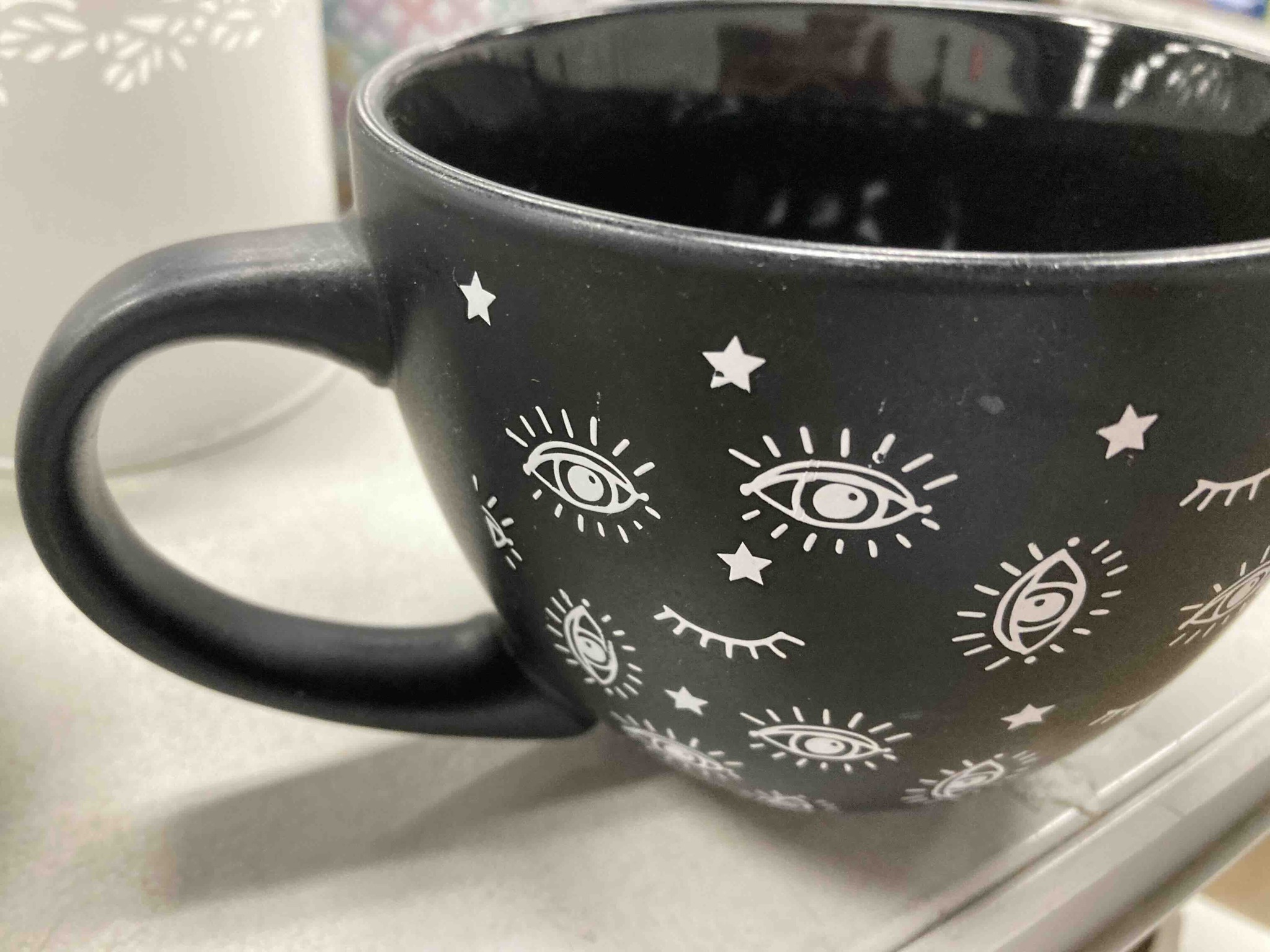 This is a wide-mouthed, bowl-style ceramic mug featuring a distinctive matte black exterior finish. The exterior is decorated with a celestial and occult-inspired pattern consisting of various 'all-seeing eye' motifs—some open with radiating lashes and others closed—interspersed with five-pointed white stars. The interior of the mug is finished with a contrasting high-gloss black glaze, which provides a functional, easy-to-clean surface. Typically constructed from stoneware or earthenware, the mug features a thick, D-shaped handle attached to a rounded, generous body. The craftsmanship reflects contemporary mass-produced giftware, often associated with atmospheric or 'boho-chic' home decor styles from the late 2010s to the present. The condition shows minor signs of use, including slight surface scuffing on the matte finish near the handle and some visible dust or lint particles, which are common with matte surfaces. There are no apparent chips, cracks, or structural repairs visible in the provided image. The print quality of the white graphics appears crisp, suggesting a screen-printed or decal application that has remained intact without significant fading.