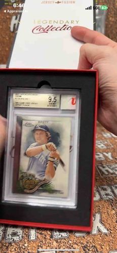 This item is a premium collectible containing a 2022 Topps Allen & Ginter Chrome trading card of Hall of Famer George Brett, housed within an official Jersey Fusion 'Legendary Collection' presentation box. The card is professionally graded 9.5 Gem Mint, emphasizing its exceptional physical condition with sharp corners, clean edges, and vibrant color reproduction. The card features Brett in a batting stance wearing a classic Kansas City Royals uniform. It is encapsulated in a protective clear plastic slab that includes a certification label detailing the grade and the inclusion of a game-used jersey swatch integrated via the Jersey Fusion process. The card is set into a custom black foam insert within a high-quality red-bordered display box. The inner lid features the 'Legendary Collection' branding in gold and maroon script. The set represents a modern high-end hobby release that combines nostalgic player imagery with authentic memorabilia. The condition appears pristine, suitable for high-tier sports memorabilia investment or private collections. The craftsmanship of the presentation box suggests a limited or special edition release aimed at serious collectors tracking Hall of Fame talent.