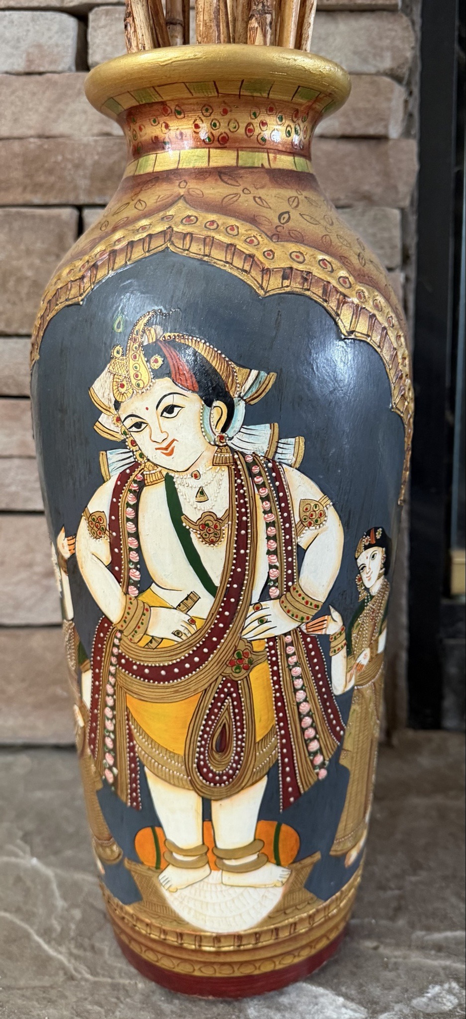 Hand-Painted Terracotta Vase Featuring Lord Krishna