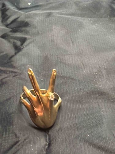This is a unique figural ring crafted in the shape of a human hand, specifically designed to wrap around the finger. The ring is constructed from a gold-toned metal, likely yellow gold or gold-plated bronze/silver, featuring a polished finish that highlights the anatomical details of the palm and fingers. The hand motif is rendered in a surrealist or avant-garde style, showing four primary fingers and a thumb that curve upward from a central base. A notable feature is a small circular element, possibly a clear gemstone or diamond accent, positioned specifically on the ring finger of the figural hand, creating a 'ring within a ring' effect. The construction appears to be a solid cast piece with a tapering band that integrates seamlessly into the wrist portion of the hand. In terms of condition, there is visible surface wear including minor scratches and a slight dulling of the luster in the recessed areas, which may indicate a vintage age, possibly mid-20th century or later. There are no clear maker's marks visible in the image, but the quality of the casting and the creative design suggest a piece of designer costume jewelry or a custom artisan work rather than mass-produced retail jewelry. The piece demonstrates high level of craftsmanship in its anatomical proportions and the intentional placement of the decorative stone.
