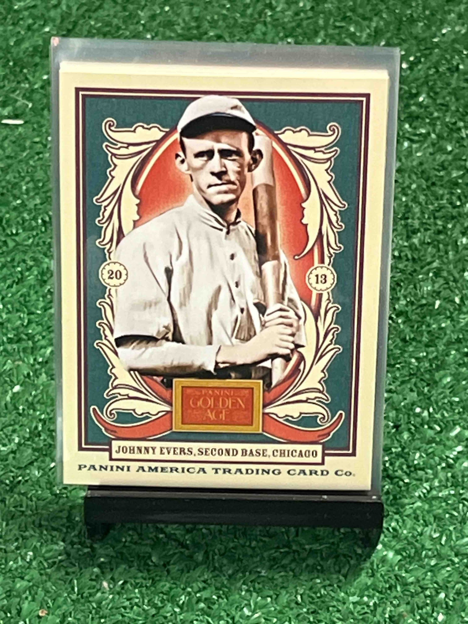 This is a modern collectible baseball card produced by the Panini America Trading Card Co. in 2013, featuring Hall of Fame second baseman Johnny Evers of the Chicago Cubs. The card is designed with a vintage aesthetic, utilizing a 'Golden Age' motif with ornate scrollwork flourishes framing a central oval portrait. The color scheme features deep forest green, cream, and reddish-orange gradients. Evers is depicted in a monochromatic sepia-toned photograph, wearing a period-appropriate collared jersey and cap while holding a baseball bat. The year '2013' is split across two decorative medallions on the left and right sides. Below the image, a gold-colored plaque reads 'PANINI GOLDEN AGE,' followed by a text banner stating 'JOHNNY EVERS, SECOND BASE, CHICAGO.' The card is housed in a clear protective sleeve and displays clean corners and edges, suggesting it is in near-mint to mint condition. The cardstock appears to be of standard weight for modern collectible sets, finished with a semi-gloss or matte coating that mimics the look of early 20th-century tobacco cards but with contemporary high-resolution printing quality.