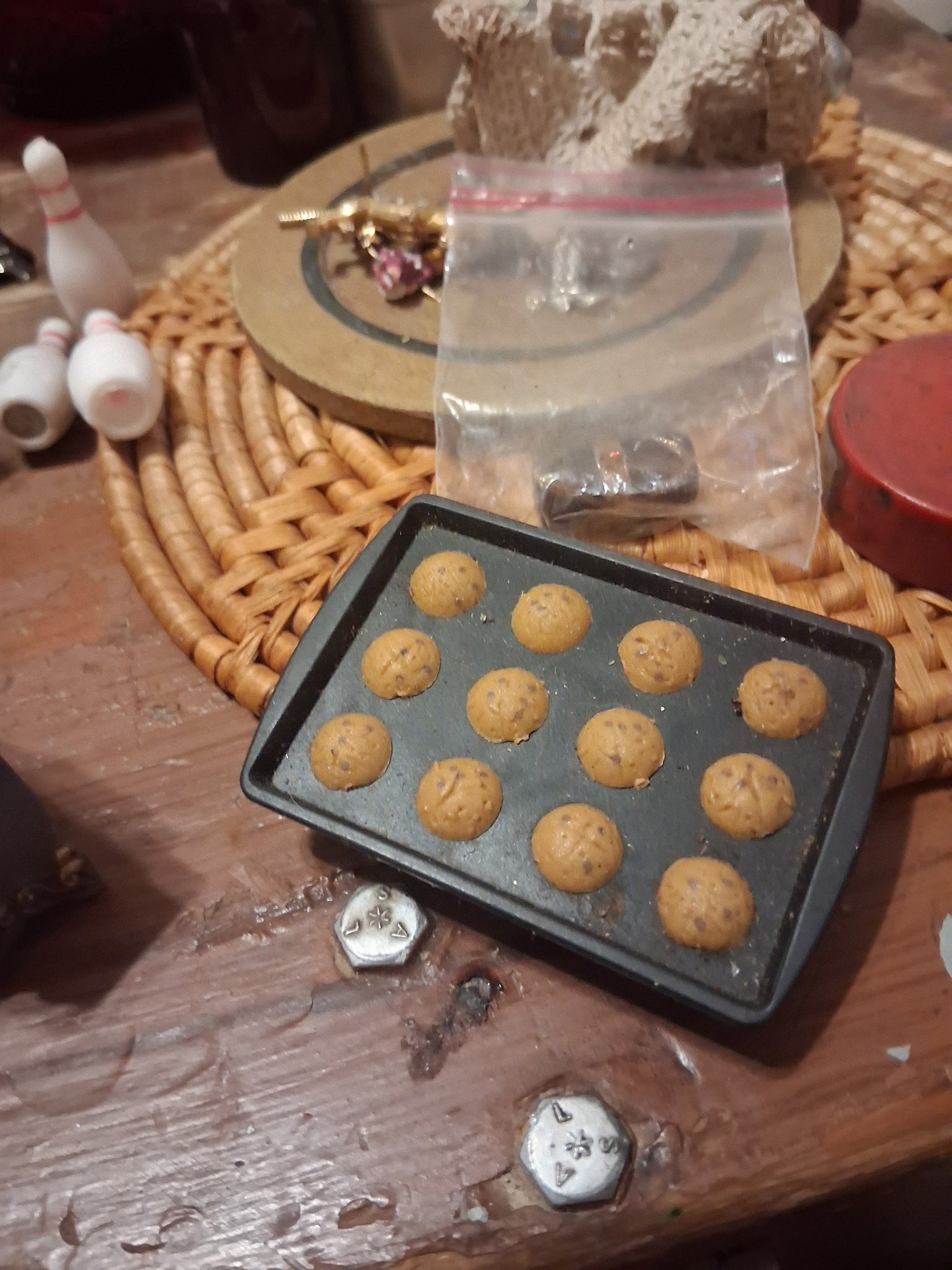 This item is a 1:12 scale dollhouse miniature featuring a rectangular black baking tray with twelve individual chocolate chip cookies. The tray is likely composed of painted metal or high-density plastic, featuring a matte finish and a raised lip around the perimeter to mimic a professional baking sheet. Each cookie is meticulously handcrafted, likely from polymer clay, showing a realistic golden-brown 'baked' color with dark brown flecks representing chocolate chips. The cookies are arranged in a neat three-by-four grid, though each exhibits slight variations in texture and chip placement, suggesting artisanal production rather than mass-molding. The texture of the cookies is porous and irregular, adding to the realism. The condition appears excellent with no visible chips or fading, though some fine dust and debris are present on the tray surface. There are no visible maker's marks, but the level of detail is characteristic of contemporary miniature artists specializing in faux food. The item is shown alongside other miniatures including bowling pins and a woven mat, emphasizing its diminutive scale.