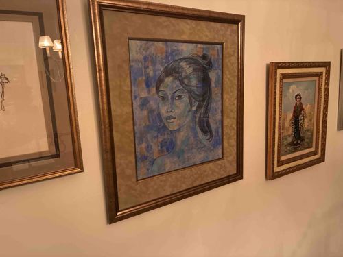 This artwork is a figurative portrait typical of the Dutch-born artist Han Snel, who spent the majority of his life in Bali. The central piece features a stylized depiction of a Balinese woman in three-quarter view, rendered in a distinctive palette dominated by cool blues, soft purples, and muted grays. Snel's signature technical approach is evident in the dappled, mosaic-like background and the delicate, elongated features of the subject's face. The woman is depicted with dark hair pulled back in a traditional bun, with large expressive eyes that are a hallmark of Snel's mid-century aesthetic. The medium appears to be oil or acrylic on board or heavy paper, exhibiting a textured surface common in his later works. The painting is professionally housed in a large, tiered gilt frame with a textured champagne-colored matting that provides a substantial border. The frame shows minor surface dust but appears structurally sound with no significant losses to the gilding. Historically, Snel’s work bridged the gap between Western post-impressionism and Indonesian cultural subjects, often focusing on the grace and beauty of Balinese inhabitants. This piece likely dates from the 1960s or 1970s, representing his mature period of stylized tropical portraiture. The rhythmic application of color and the harmonious, dreamlike quality of the composition distinguish this as a characteristic example of his acclaimed body of work.