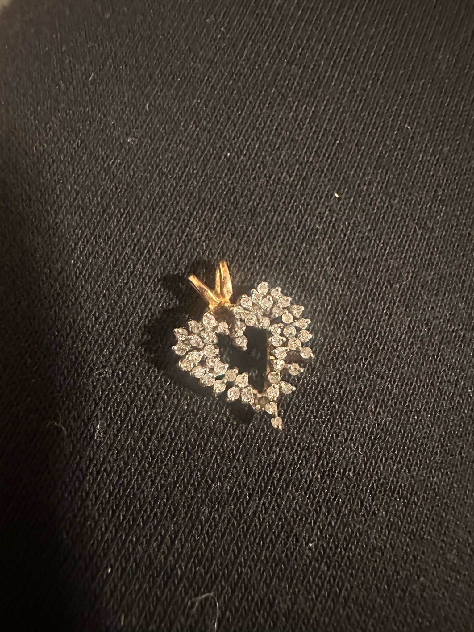 This is a small, open-heart shaped pendant featuring a double-row arrangement of round-cut gemstones, likely diamonds or high-quality cubic zirconia, set in a yellow gold mounting. The heart has a stylized, slightly asymmetrical 'tilted' design with a cluster of stones creating a ruffled or scalloped outer edge. The gemstones appear to be set in a combination of prong and pavé settings, covering the entire front surface of the heart frame to maximize brilliance. The pendant is topped with a polished yellow gold V-bale, which allows it to be threaded onto a chain. In terms of physical condition, the gold shows minor surface scratches consistent with gentle use, and some of the lower prongs appear slightly worn, though the stones seem securely held. The style is classic late 20th-century fine jewelry, typical of the 1980s or 1990s. The craftsmanship suggests a commercial-grade jewelry production where the focus was on stone density and overall sparkle. There are no visible maker's marks or metal purity stamps (like '14K' or '10K') visible from the front view, but the deep yellow hue suggests a gold alloy. The item lacks deep tarnish, indicating it is likely solid gold rather than a base metal plated alternative.