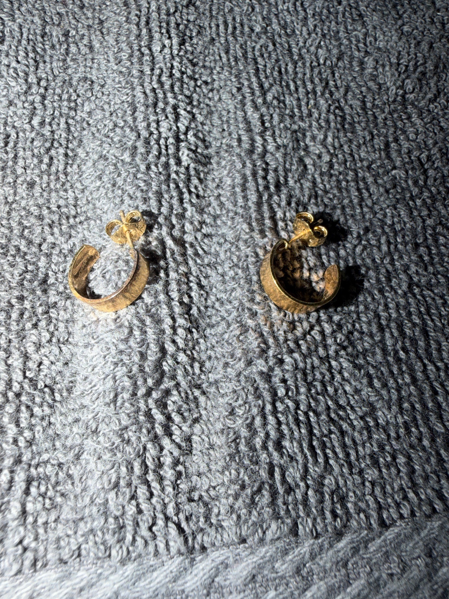 This pair of yellow gold earrings features a classic 'C' hoop or half-hoop silhouette with a high-polish finish. Each earring is constructed from a flat, wide band of metal that curves into a semi-circle, measuring approximately 12-15mm in diameter. The earrings are designed for pierced ears, utilizing a straight post mechanism secured with standard 'butterfly' friction backs (tension nuts). Based on the provided context, the material is solid gold, likely 10k or 14k given the rich yellow hue common in contemporary fine jewelry. The craftsmanship shows clean, machine-finished edges with no visible hand-hammering, suggesting a late 20th-century to modern manufacturing date. Physically, the items exhibit minor surface abrasions and micro-scratching consistent with light regular wear and handling. There is a slight visible patina and dullness on the interior of the hoops, which could be improved with professional ultrasonic cleaning. The tension on the butterfly backs appears functional. No prominent maker's marks or hallmarks are clearly visible in the provided image orientation, though they are typically located on the posts or the interior of the hoop band. The overall style is minimalist and versatile, characteristic of late 1990s through contemporary jewelry design.
