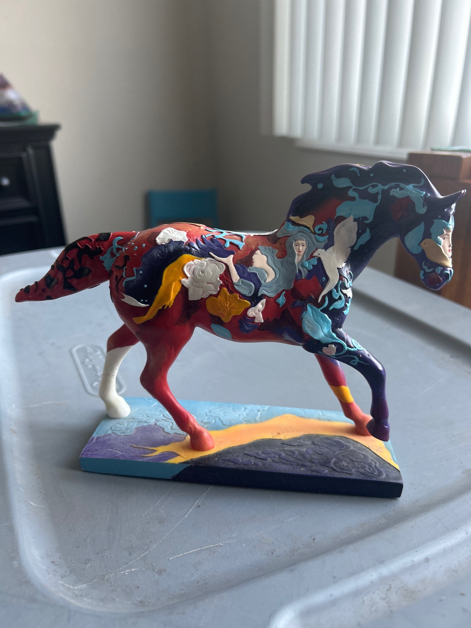 This is a resin decorative figurine from the 'Trail of Painted Ponies' collection, specifically the 'Dreaming of the Wild' design. The sculpture portrays a stylized horse in a dynamic, forward-leaning gate, mounted onto a rectangular landscape-themed base. The piece is characterized by its high-relief, multi-colored surface decoration that wraps around the entire body. The color palette is vibrant, featuring deep reds, purples, and blues contrasted with bright yellows and white accents. The intricate design incorporates surrealist and fantasy elements, including figures of women with flowing hair, birds, white roses, and various organic, swirling patterns that give the object a high degree of texture. One back leg is painted solid white, while the front right leg features a gradient from red to dark purple. The base mimics a terrestrial landscape with hills and a blue sky pattern. The construction is solid cast resin with hand-painted details. It appears to be in very good condition with no visible chips, cracks, or significant paint loss. These pieces were primarily manufactured from the early 2000s onwards, and this specific design reflects a mid-to-late production period. The quality is consistent with mass-produced collectible art, showing fine detail in the mold and bold, opaque paint application.
